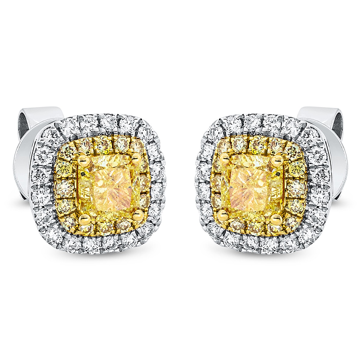 earrings 18 kt WG+YG, 40 diamonds 0,18 ct, G-si, 2 cushion 0,71 ct, yellow, 32 diamonds 0,14 ct, yellow