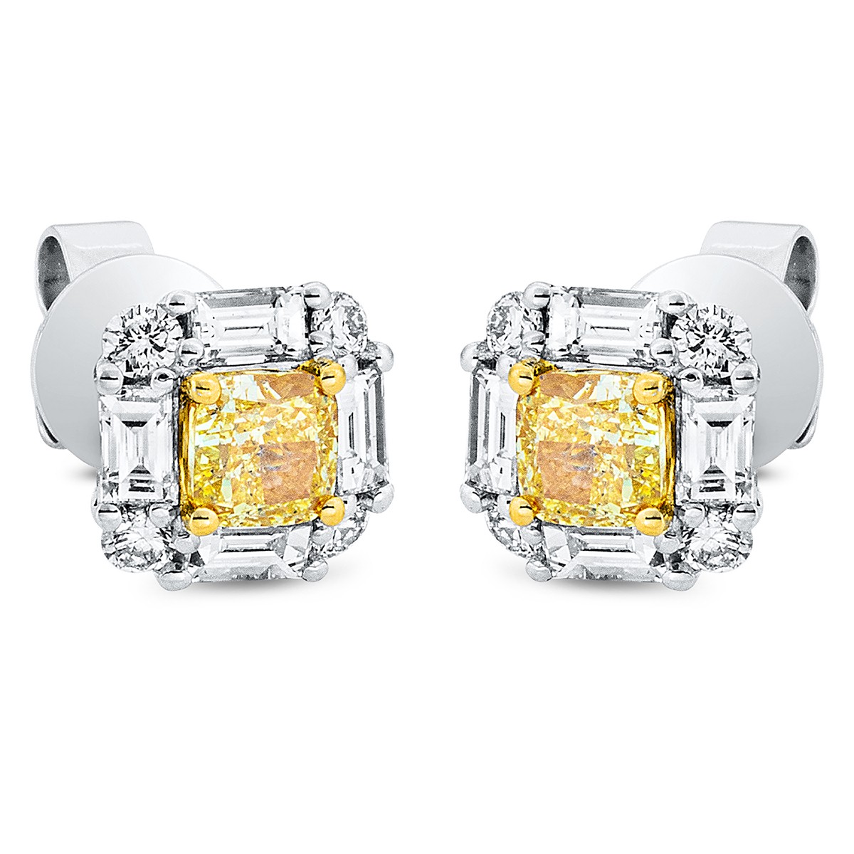 earrings 18 kt WG+YG, 8 baguette 0,48 ct, G-si, 8 diamonds 0,17 ct, G-si, 2 cushion 0,74 ct, yellow