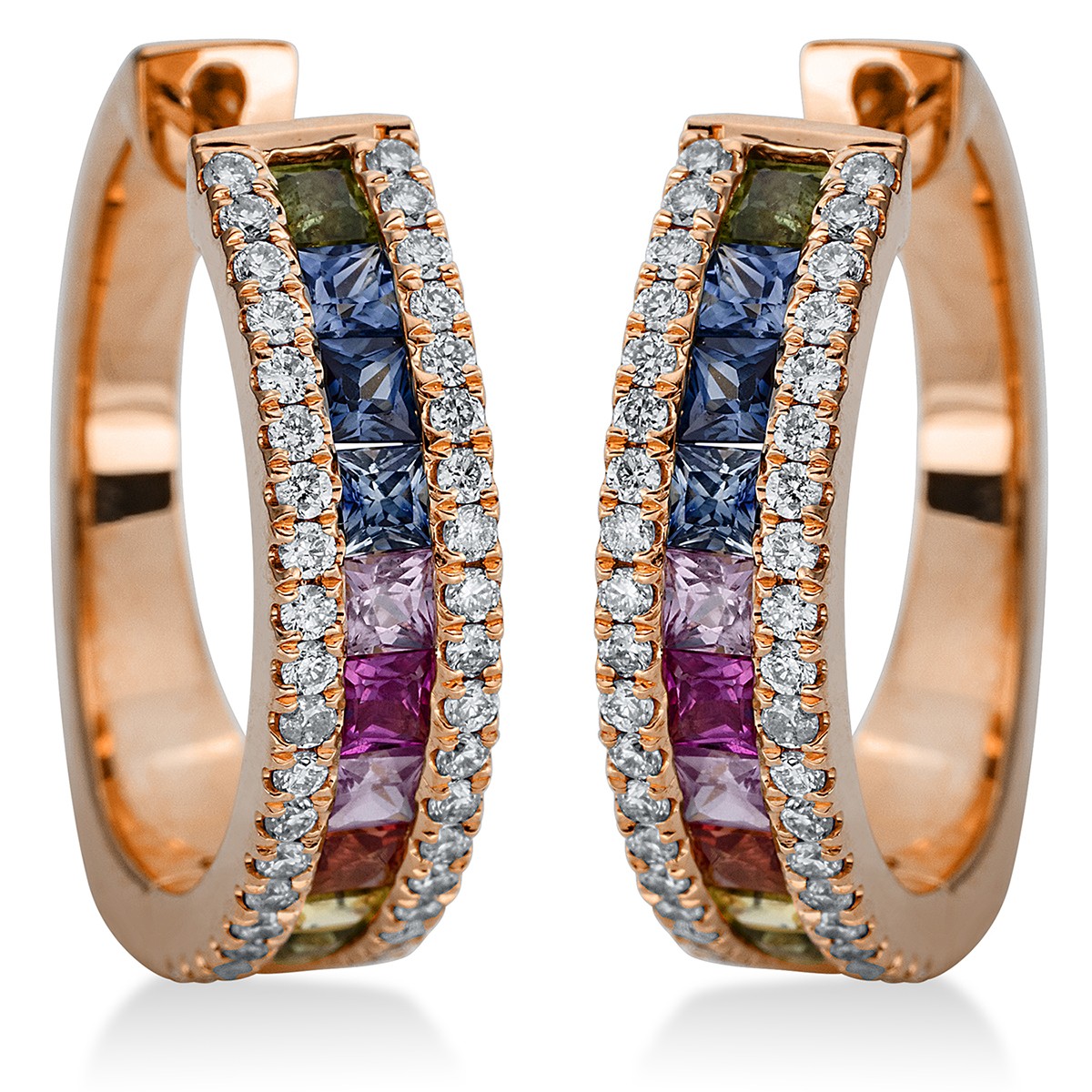 huggies 18 kt RG, 80 diamonds 0,43 ct, G-si, 22 sapphire 1,32 ct fancy, h:17,9 mm, w:18,3 mm, th:4,6 mm