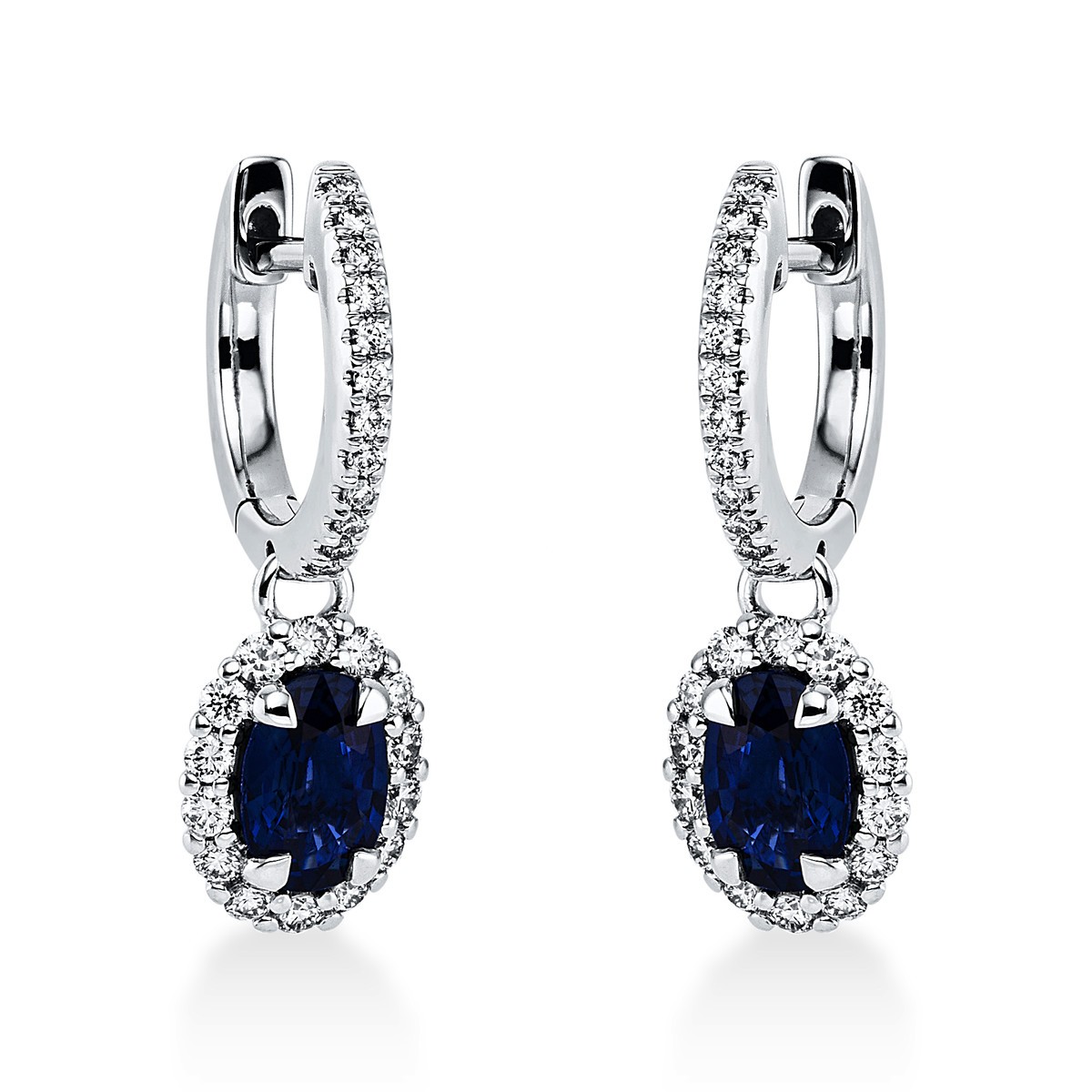 huggies 18 kt WG, 52 diamonds 0,34 ct, G-si, 2 sapphire 1,16 ct blue, h:20,6 mm, w:6,9 mm