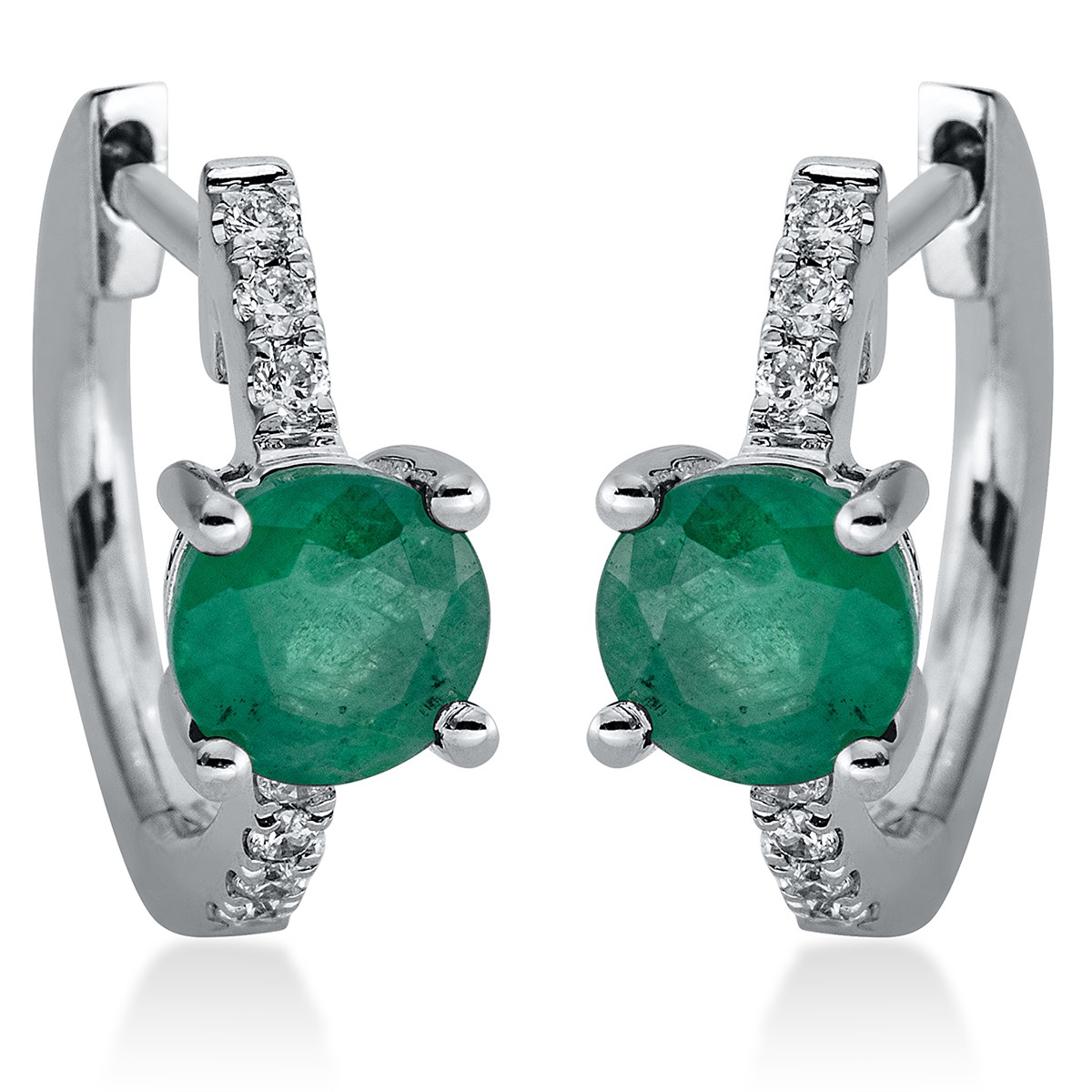 huggies 18 kt WG, 14 diamonds 0,10 ct, G-si, 2 emeralds 0,93 ct green