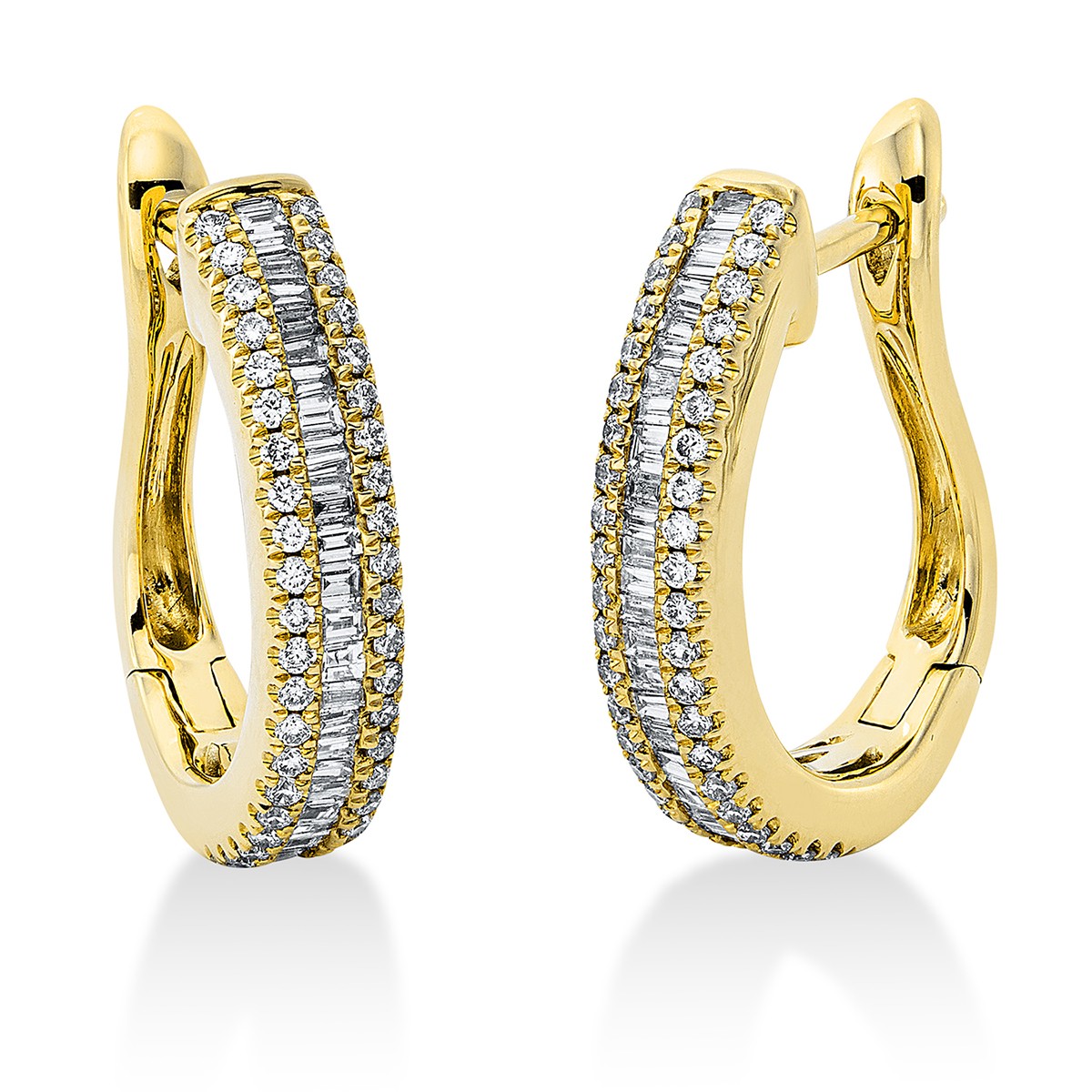 huggies 18 kt YG, 35 tapers 0,21 ct, G-vsi, 16 baguette 0,12 ct, G-vsi, 84 diamonds 0,31 ct, G-si, h:18,8 mm, w:14,0 mm, th:3,8 mm