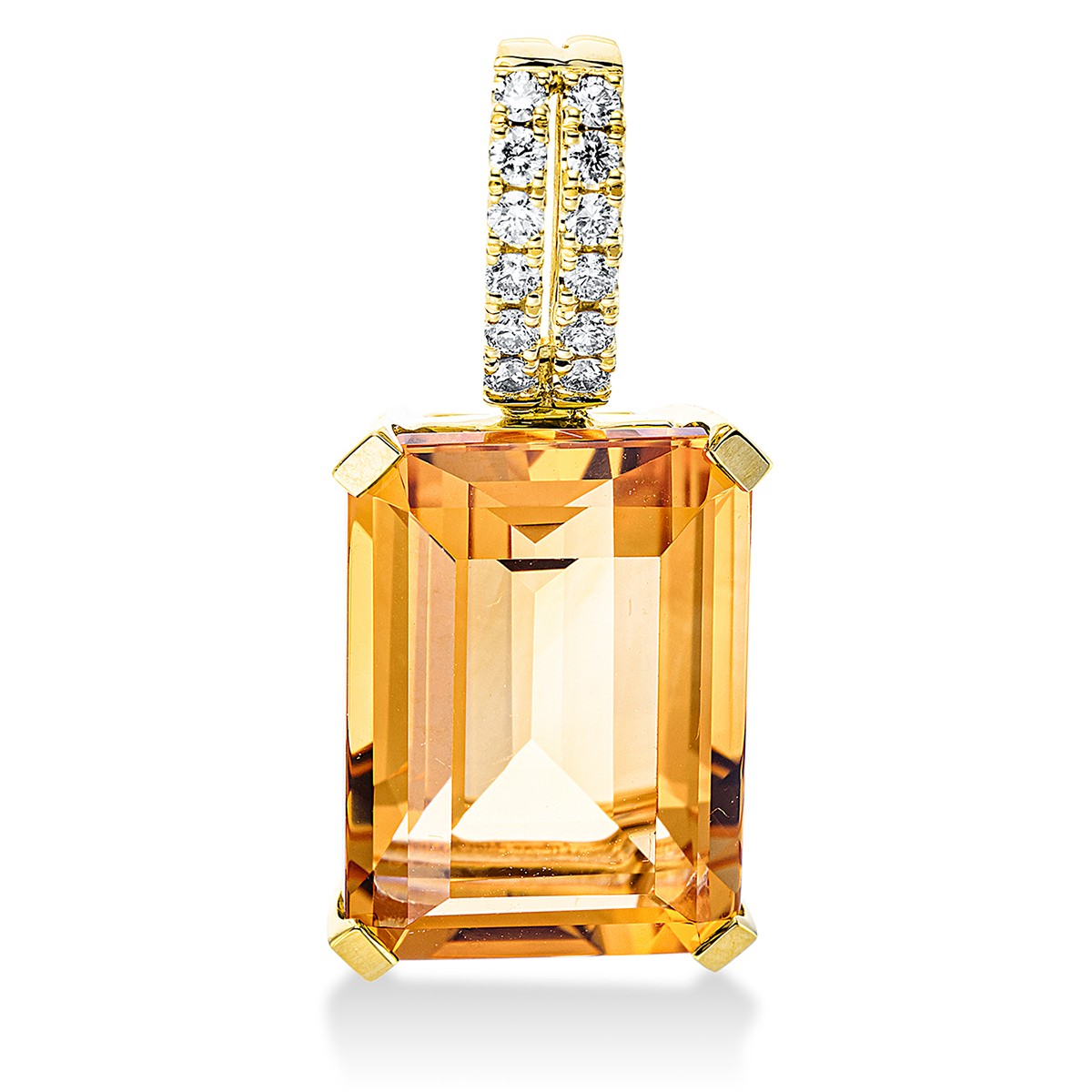 pendant 18 kt YG, with loop, 12 diamonds 0,13 ct, G-si, 1 citrine 7,50 ct yellow, h:23,0 mm, w:10,0 mm, th:7,7 mm